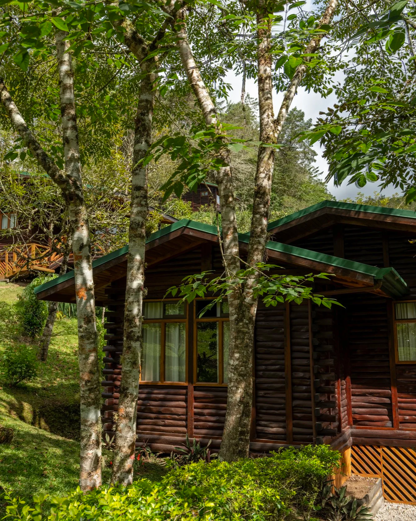 Two of the cabins are nestled close to the river, where the gentle sound of flowing water creates a naturally calming atmosphere. The third cabin offers a serene garden view with added seclusion, providing a quiet and private setting surrounded by lush greenery.
